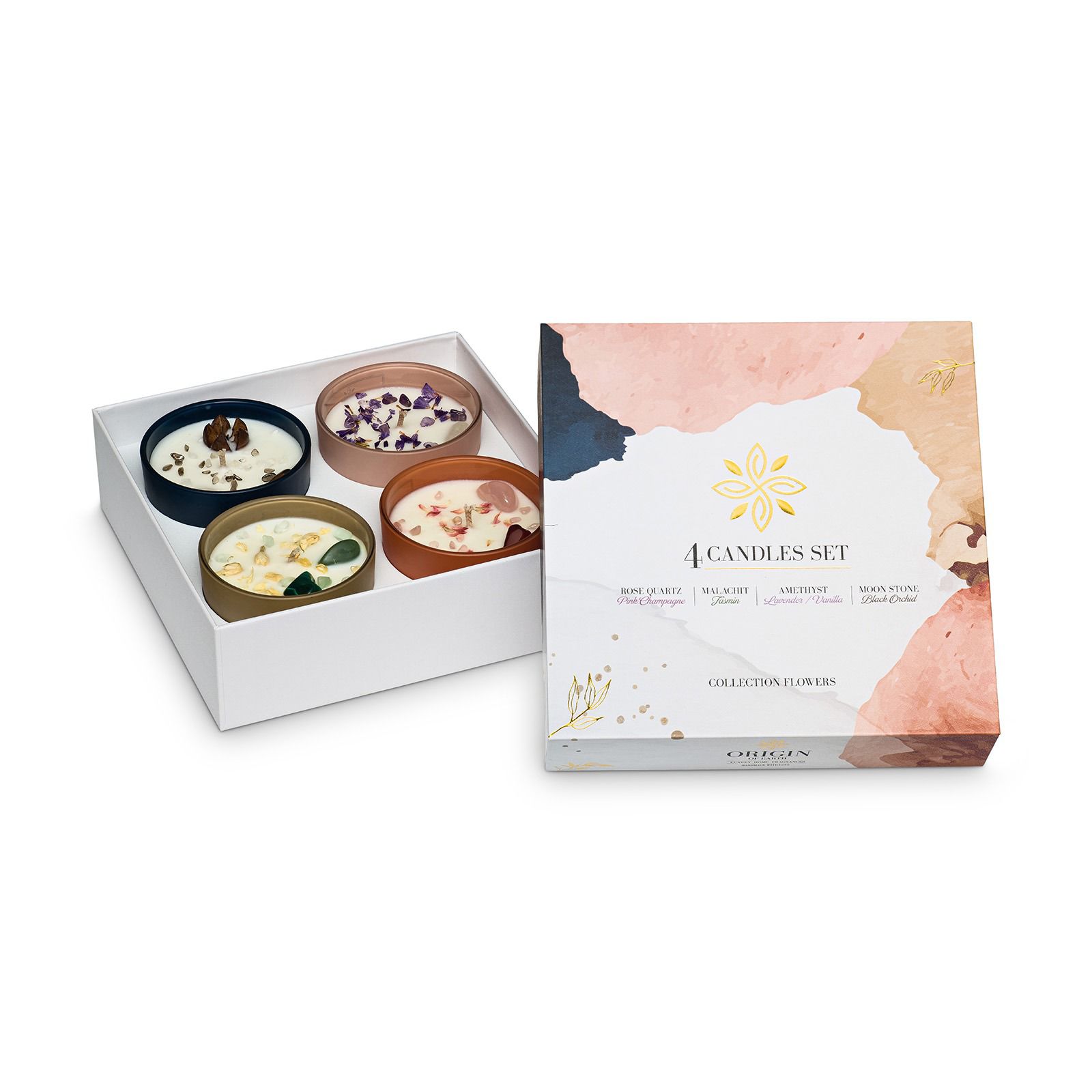 Jede Kerze ein Unikat. Von handerlesene und verstreute Blüten & Kristallsteine. Bis zu 50 Stunden Brenndauer, Docht aus reiner Baumwolle.