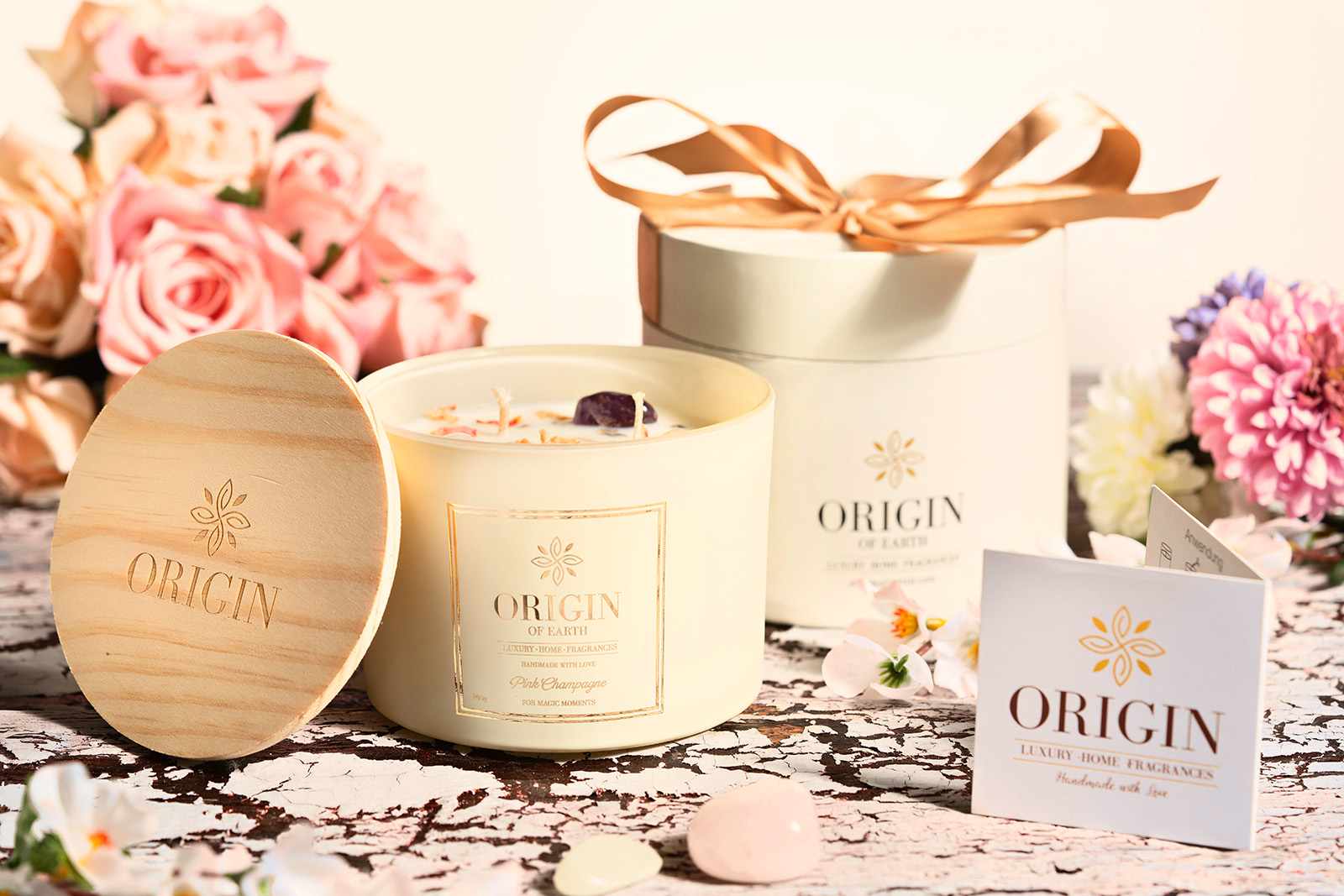 Besondere Merkmale | BLÜTEN aus Rosenpedale, Lavendelsamen, gomphrena globosaund, EDELSTEINE aus Rosenquarz, Amethyst und klarer Quarz |